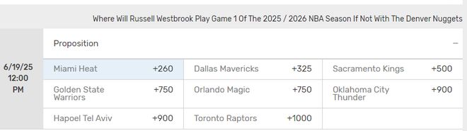 1.热火(+260)、2.独行侠(+325)、3.国王(+500)、4.勇士和魔术(+750)、6.雷霆和Hapoel Tel Aviv(+900)、8.猛龙(+1000)。